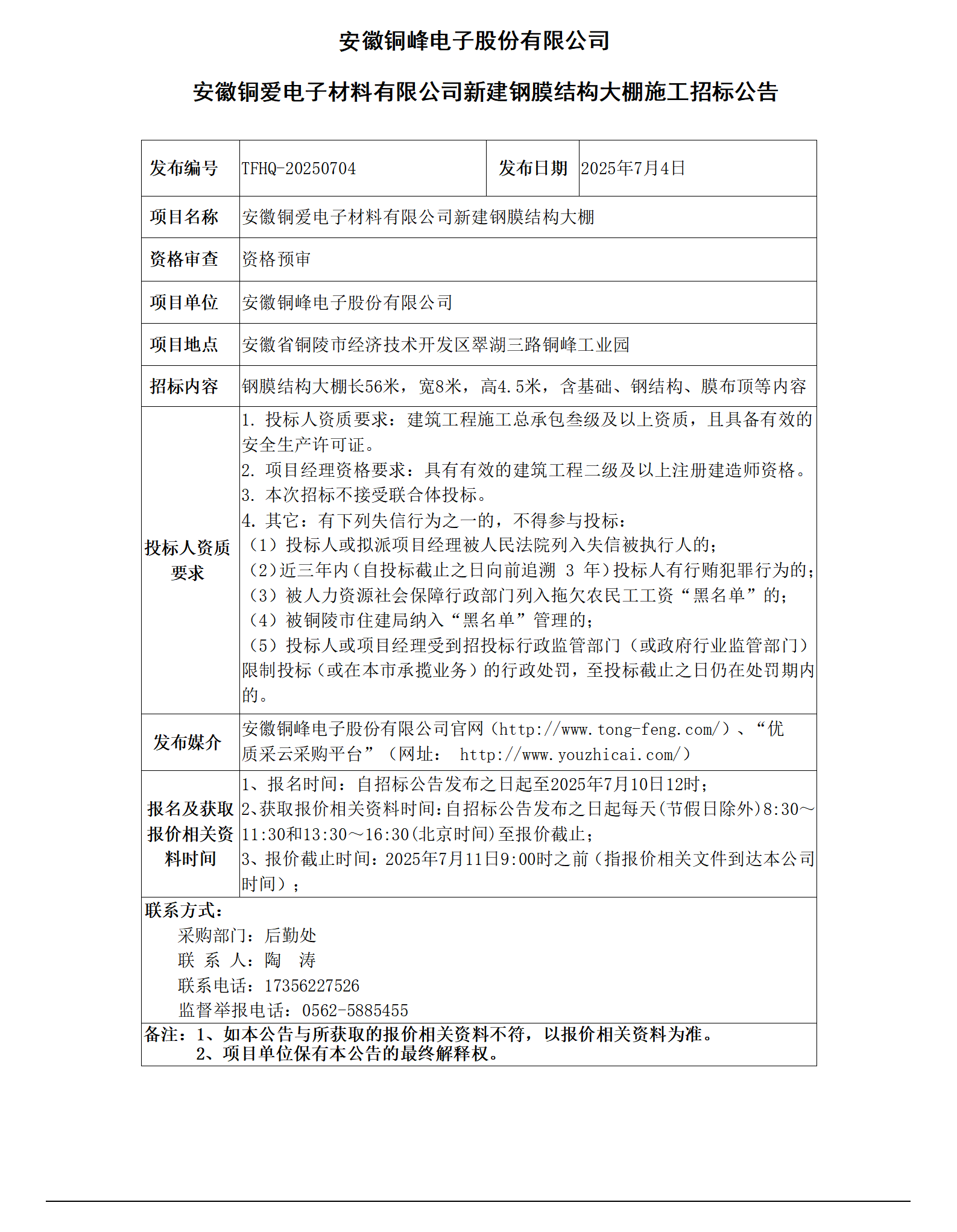 沙巴体育 (安徽铜爱电子材料有限公司新建钢膜结构大棚招标公告)_01