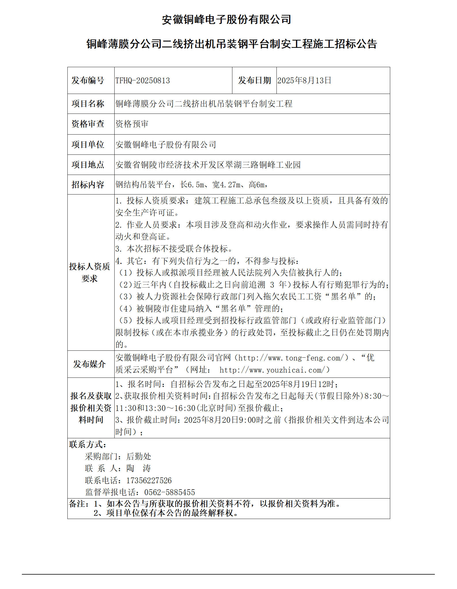 沙巴体育 (铜峰薄膜分公司二线挤出机吊装钢平台制安工程招标公告)_01