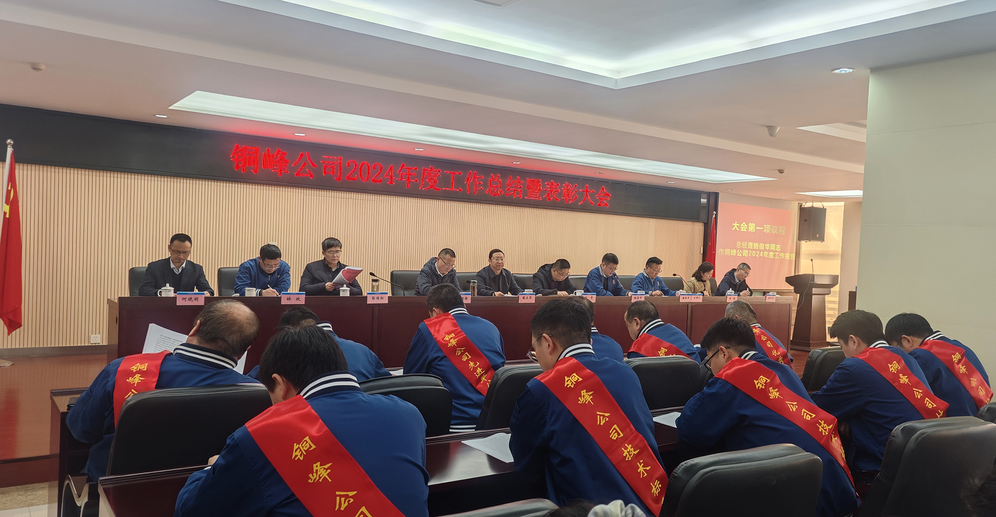 1月22日,公司在办公楼二楼职教室隆重召开2024年度工作总结暨表彰大会。铜陵经开区党工委委员、管委会副主任蒯正军,铜陵大江投资控股有限公司董事长刘奇,公司党政领导班子成员,各经营单位与职能部门管理人员,部分职工代表、新进大学生,以及先进集体、先进个人代表等参加会议。公司党委副书记潘世宇主持会议。
