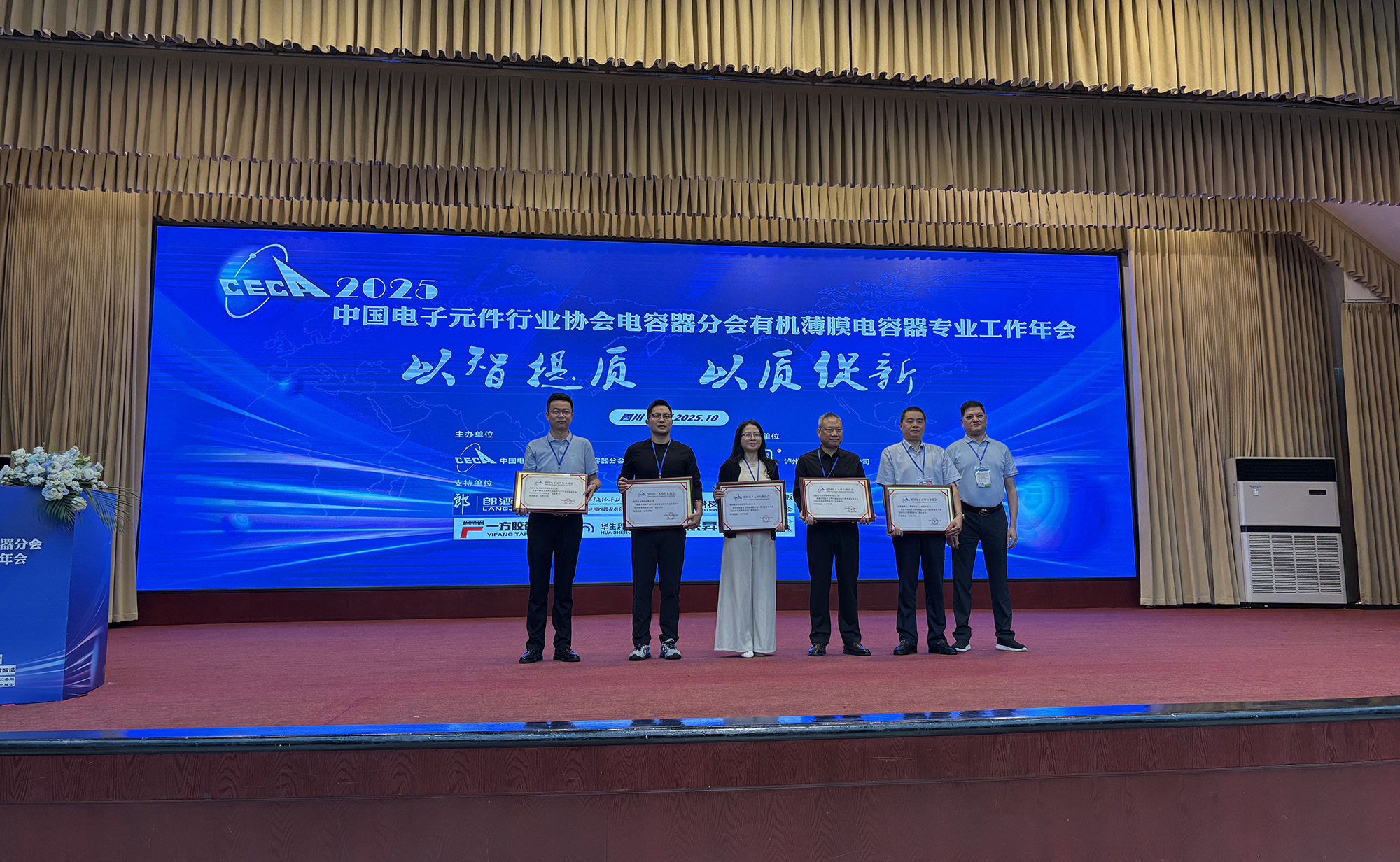 10月14日至17日,中国电子元件行业协会电容器分会有机专业2025年工作年会在四川泸州成功举办。中电元协常务理事、电容器分会第九届副理事长、公司总经理鲍俊华代表公司出席并作主题交流报告。薄膜分公司获评电容器分会2025年度“优秀供应商”荣誉称号。